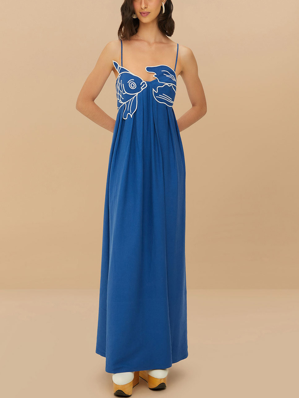 This enchanting piece captures the essence of tropical charm with its asymmetrical neckline and flowing silhouette. The mesmerizing fish motif dances across responsible materials in luscious shades of green and blue, evoking a sense of underwater wonder. This dress’s playful patterns and unique cut offer a delightful blend of style and conscious craftsmanship, making it a true standout in any wardrobe.