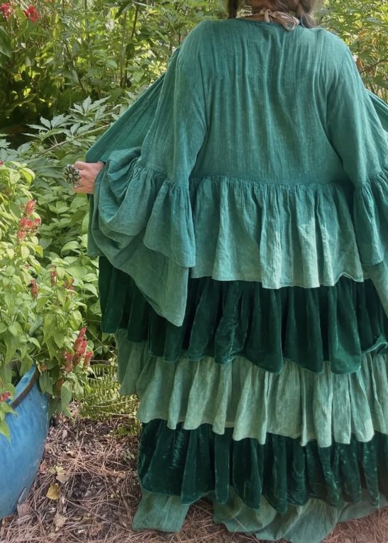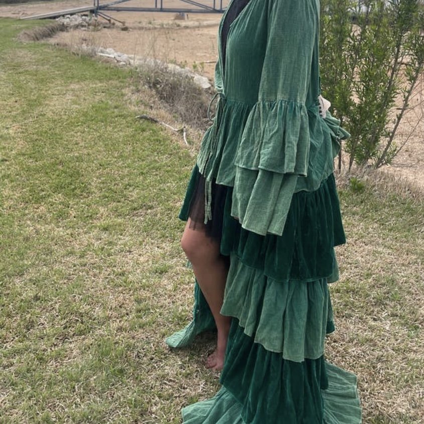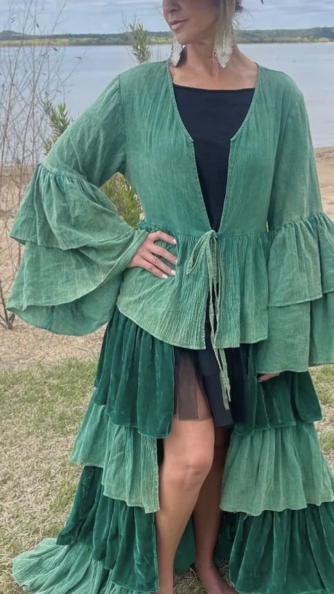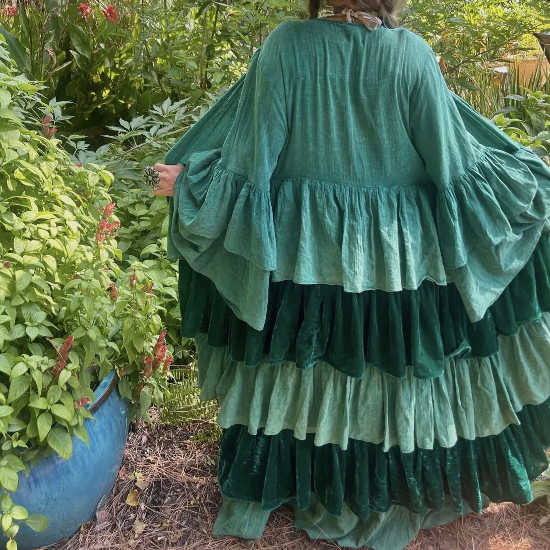 his AMAZING Velvet duster is a show stopper. This gorgeous art piece can be worn by all!! The last ruffle is cotton so if it is too long it can be cut off to make it shorter. One size fits most. Looks great paired with the Enchanted Garden Dress.